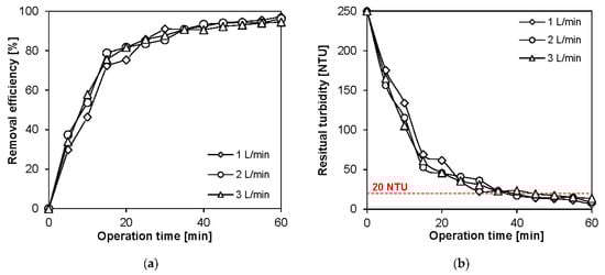 Turbidity removal at different liquid flows: (a) removal efficiency and (b) residual turbidity.