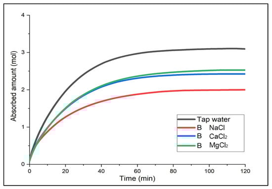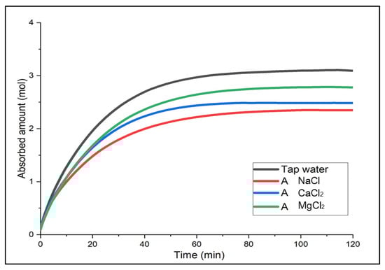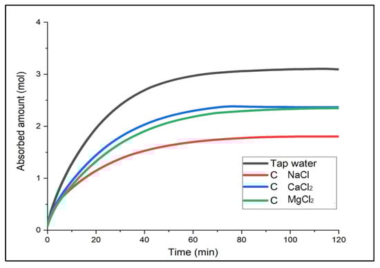 First, Solution A with the smallest electrolyte concentration indicated high gas solubility in the order of MgCl2 > CaCl2 > NaCl [18]. For the first 20 min, the absorbed amount of CO2 (mol) between CaCl2 and MgCl2 was similar, with 1.65 mol and 1.68 mol, respectively, but there was a difference in solubility value as CaCl2 was saturated first. In Solution B and C, the saturation time was the fastest for CaCl2. In Solution B, CaCl2 and MgCl2 showed a similar trend for about 40 min; after two hours, there was a slight difference in solubility, and CaCl2 showed the greatest solubility in Solution C. To summarize, although overall, the solubility of CaCl2 and MgCl2 was similar, CaCl2 indicated better performance in the earlier phase. In particular, CaCl2 did not show a large difference in the gas solubility even with the different concentration levels. This implies that it would be easier to use at temperatures below zero because it does not require changing the concentration level of the solution when the temperature changes. Moreover, it is relatively economical and accessible. Hence, CaCl2 was considered the optimal brine in terms of the initial absorption performance, affordability and properties, and absorption performance deviation by different concentration levels.