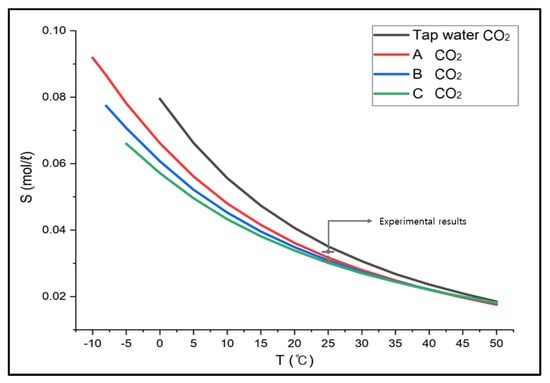 We compared the CO2 absorption performance in CaCl2 brine, which was determined as the optimal brine earlier, with the simulated values from ASPEN PLUS. First, our experimental results indicated that the solubility of CO2 in CaCl2 brine was 0.0355 mol/L in Solution A, 0.0347 mol/L in Solution B, and 0.0338 mol/L in Solution C. On the other hand, the simulated results from ASPEN PLUS showed 0.0317 mol/L in Solution A, 0.0309 mol/L in Solution B, and 0.0301 mol/L in Solution C. The experimental results and errors were in the range between 10.70% and 10.95%. The errors could be estimated because the amount of the absorbent solutions could gradually decrease, and the absorption concentration could increase relatively when the absorbent solutions were partially mixed with liquid drops during the CO2 flow. The results between the actual experiments and the ASPEN simulation were similar, implying it can be further applied to other hazardous gases and different conditions. (Figure 5) describes the result of CO2 gas solubility in CaCl2 brine between −10 °C and −50 °C. It suggests the solubility of CO2 decreased as the concentration and temperature increased [19,20].