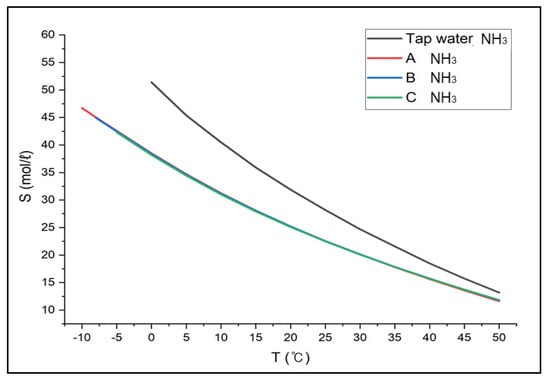 Based on the verification test results from ASPEN PLUS, we expanded the application to major hazardous gases, i.e., ammonia, ethylene oxide, and methylamine. Ammonia showed the solubility of 46.73 mol/L~11.61 mol/L (between −10 °C and 50 °C) in Solution A, 44.94 mol/L~11.79 mol/L (between −8 °C and 50 °C) in Solution B (between −8 °C and 50 °C), 42.30 mol/L~11.84 mol/L (between –5 °C and 50 °C) in Solution C, respectively in Figure 6. The solubility in tap water was 51.40 mol/L~13.18 mol/L (between 0 °C and 50 °C), and the solubility in brine was decreased by about 20% compared to that in tap water. In addition, the gas solubility in tap water at 25 °C was the same as in brine between 13 °C and 15 °C. This suggests the absorption efficiency would not drop even if the absorbent solution were replaced with brine from tap water.