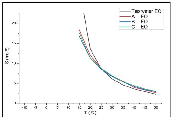 Since the boiling point of ethylene oxide is 10.7 °C and does not exist as gas below the boiling point, the results below approximately 15 °C were not considered. The results between 15 °C and 50 °C showed the solubility of 18.33~2.61 mol/L in Solution A, 16.74~2.89 mol/L in Solution B, 17.59~3.01 mol/L in Solution C in Figure 7. The solubility in tap water was 28.88~2.25 mol/L (between 0 °C and 50 °C), which was higher than the solubility in brine at low temperatures, but the solubility in tap water became lower than in brine as the temperature increased above 25 °C. Because the solubility of ethylene oxide in brine at a temperature below 25 °C was greater than in tap water at 25 °C, implying it is acceptable to replace the absorbent at any time regardless of temperatures below zero.