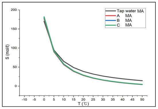 Similarly, for methylamine, when examining the results between 0 °C and 50 °C, which is above the boiling point, the solubility in Solution A was 177.24~4.07 mol/L, 180.28~4.44 mol/L in Solution B, 181.86~4.63 mol/L in Solution C, respectively. The solubility in tap water was 170.28~14.24 mol/L (0~50 °C) in Figure 8. Although the solubility in brine and tap water was similar at low temperatures, there was a difference of about 10 mol/L at higher temperatures. When brine was used as an absorbent, the solubility decreased by about 33%. In addition, the gas solubility in tap water at 25 °C was the same as in brine between 16 °C and 19 °C, suggesting that the absorption efficiency would not decrease even if the absorbent were replaced with brine from tap water.