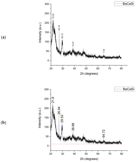 The XRD analysis of the Subcoal™ powder produced a large peak of amorphous compounds at 2θ of 23° composed of barium (Ba), calcium (Ca), and silica (Si), as shown in Figure 1. The first amorphous peak compounds consisted mainly of Ba, Ca, and Si. The next peak confirmed a crystalline compound at 27° with an intensity of 161 a.u. while the second amorphous peak appeared at 30°. Previous research in this area, specifically in relation to the analysis of polymers with XRD, by Marsh [25] found that amorphous peaks were dominant, as shown by their defined peaks. However, the amount of crystalline matters in plastic and paper waste exceeded the randomly distributed amorphous ones.