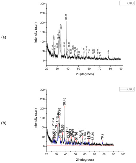 Figure 2 shows the XRD analysis of Subcoal™ ash in terms of peak height (a) and area (b) that was used to identify the crystallinity of the sample. The area of a peak is calculated by multiplying the FWHM (full width at half maximum) times the height. The area under the peak provides information on the percentage of crystallinity. The height of the main peaks indicates the intensity of each polymorphic phase. The largest crystalline peak of calcium chloride (CaCl) was obtained at 38.5° with an intensity of 245 au. Semi-crystalline peaks were also detected between 30° and 35°. The remaining signals included small crystalline peaks and experimental noise. The crystallinity percentage in ash based on the total area of all peaks was found to be 37.67%. In comparison with the Subcoal™ sample, the reduction in the crystallinity can be attributed to the decomposition of crystalline cellulose fibres [29]. The crystalline minerals and metal oxides in the ash may behave as a catalyst of thermal decomposition reactions [30].