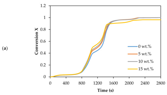 The olivine in CO2 gasification exhibited a similar performance as that in dolomite. The olivine also promoted the decomposition of biomass. It can be seen from Figure 4a; the reaction time decreased as the catalyst loading increased. The complete conversion reaction decreased from 792.7 to 767.7 °C as the olivine concentration increased from 0 to 15 wt.%. The conversion curve also showed two regimes of decomposition: the first was between 0.2 and 0.45, and then from 0.45 to 0.8.