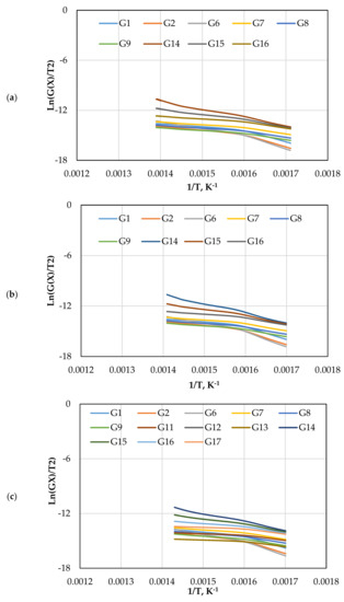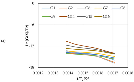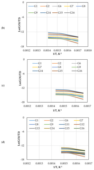 Both pre-exponential constant and are independent of temperature. By combining Equations (5) and (6), the following equation is obtained: