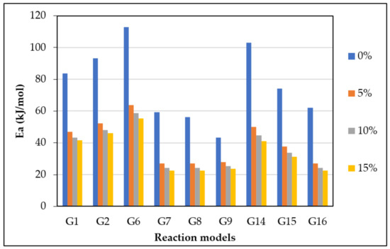 Figure 7 displays the reaction kinetic graphs of gasification at different loadings of olivine. Figure 8 and Table 6 compare the values of at various contents of catalyst, which was estimated using different mechanism models. Model G15 at 15 wt.% exhibited excellent linearity with the highest R2 value of 0.992, which makes it a good candidate for estimation and reaction mechanism.