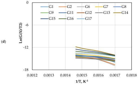 The from Equation (13) above can be achieved by plotting term against (1/T). The thermal decomposition mechanism function can be approximated from 19 mechanism models for solid–gas reactions, as listed in Table 3. The accuracy of this method largely depends on the selection of the mechanism function and correlation coefficient (R2). However, if the is known, the reaction kinetics can be determined. The y-intercept of the in the curve gives the value of the term , which can be rearranged to obtain the value, as follows: