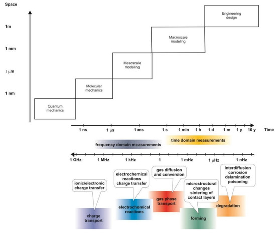 The phenomena underpinning FC operation and connection with an upstream fuel processor or a downstream user occur on very different time and length scales, requiring proper modelling tools to achieve the desired information. Careful validation against the basic kinetic, thermodynamic and electrochemical principles, as well as against experimental data, is compulsory, but the choice of the proper modelling methods is also fundamental. A very detailed review made a comprehensive description of the available equations to compute transport phenomena, electrochemical thermodynamics and kinetics and cell performance [5]. The scheme of the interconnections between these modelling activities and the different time and length scales of each of them are sketched in Figure 1 and Figure 2.