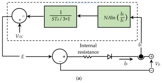 The behaviour of a PEMFC stack was investigated considering stability and efficiency under different conditions, to optimise the operating points during connection to the grid [19]. The equivalent circuit of the simulated PEMFC is reported in Figure 3. V0C is the open circuit voltage, Td is the response time, N the number of cells, Ifc and Vfc the current and voltage of the cell and IE the exchange current.