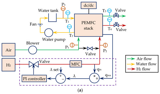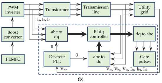 (a) PEMFC scheme and (b) blocks for connection to the grid. Reproduced from [19] under the Creative Commons Licence.