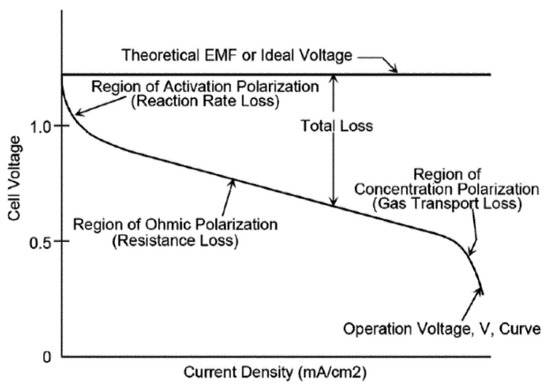 Polarisation curve of a PEMFC. Reproduced from [20] under the Creative Commons Licence.
