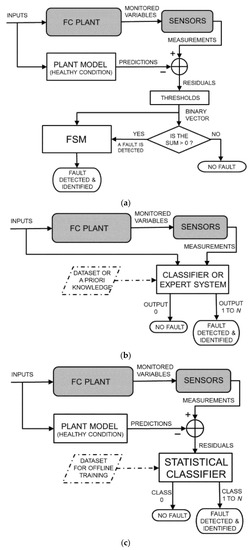 Conceptual sketch of fault detection and isolation (FDI). (a) classical model-based FDI based on parity equations with output errors, residual binarisation, and fault signature matrix; (b) data-driven FDI; (c) hybrid approach. Reproduced from [39] under the Creative Commons Licence.
