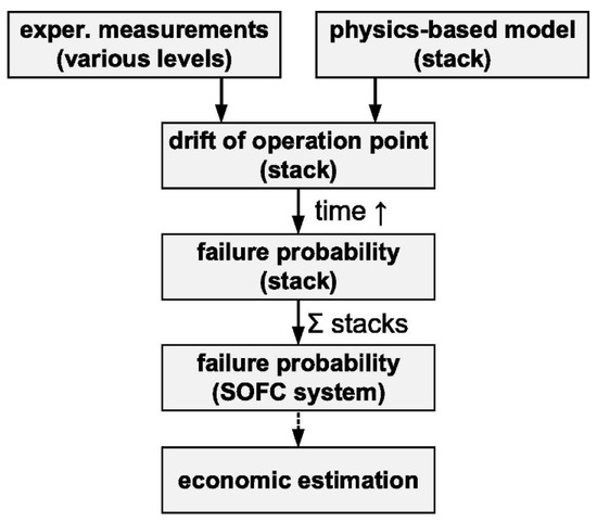 The degradation modes for SOFC have been extensively analysed by Eichhorn Colombo and Kharton [43], including coking, sulphur poisoning, formation of local hot spots due to excessive current densities and frequent power cycling. In order to model the probability of failure, or in other terms, the reliability of the system, a hierarchy of analysis is proposed, as in Figure 9, and the failure probability is correlated with the stresses of the cell or stack, which determine the correlation between current density and failure probability.