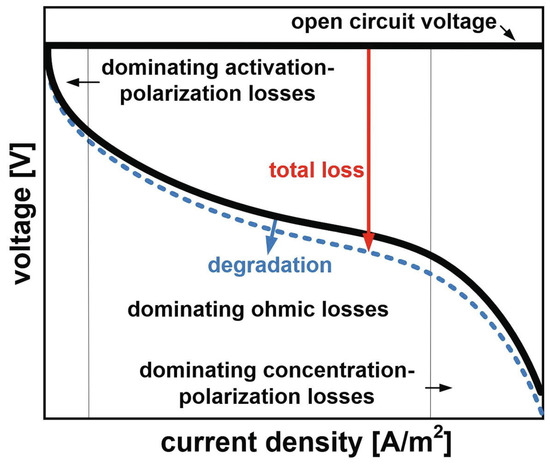 Principal current density-voltage relationship for a SOFC, including deactivation. Reprinted with permission from ref. [43]. Copyright 2021, Elsevier.