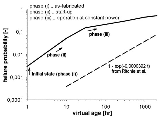 Overall, at constant current density, SOFC degradation rate increases with operating temperature, while at constant temperature it increases with the current density. The failure probability can be plotted vs. the virtual age of the system, as in Figure 11.