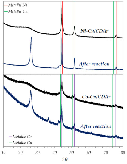 Information about the crystalline phase of the active metals before the reaction was addressed by the XRD technique in Figure 1. For the Ni–Cu/ArDC catalyst, it is observed that the peaks appearing at 44.3°, 51.6° and 76.0° do not correspond to the metallic Ni (45-1027 JCPDS) or Cu (04–0806 JCPDS) patterns. The shift observed in the 2θ value for these peaks can be associated with the formation of a Ni–Cu alloy [43]. However, the XRD pattern depicted in Figure 1 for Co–Cu/ArDC shows that both Co and Cu were present in metallic form (15–0806 JCPDS for Co0 and 04–0806 JCPDS for Cu0), not observing the formation of an alloy in this case. In addition, the Ni–Cu/ArDC and Co–Cu/ArDC patterns do not show any peak associated with the presence of oxidized species, confirming that the catalysts are completely in the reduced state.