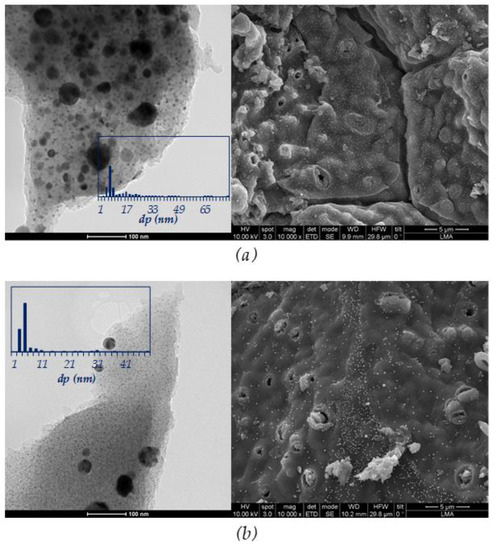 Morphology of the bulk Ni–Cu/ArDC and Co–Cu/ArDC catalysts was addressed by electron microscopy images presented in Figure 2. The SEM images show the macrostructure and smoothness characteristic of this type of carbonized material for both catalysts prepared. In addition, TEM images obtained for the two fresh catalysts indicate that the metal nanoparticles were well distributed on the ArDC support owing to their characteristic biomorphic textural structure. TEM images were employed to estimate the particle size of the incorporated metals by measuring not less than 500 particles from different sample areas. The Ni–Cu/ArDC sample shows a trimodal metal particle size distribution, finding relatively small particles (~7 nm), intermediate particles (~17 nm) and large particles (~35 nm). Moreover, the Co–Cu/ArDC catalyst shows a bimodal metal particle size distribution with a large number of spherical nanoparticles about 5 nm and a low number of nanoparticles about 31 nm. In both cases, these metal size distributions are a consequence of the heating rate and high temperature used during the catalyst synthesis [36].