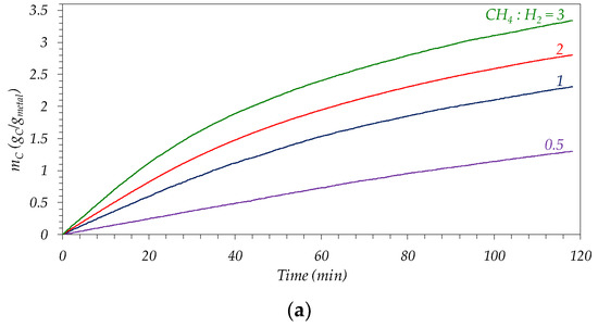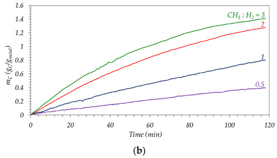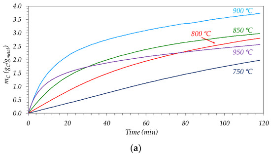 For both samples, an increase in the carbon productivity (or space–time carbon yield, calculated as the carbon concentration, mC, at a given time divided by that reaction time) is observed, and also in the initial carbon growth rate (rC0, measured from the initial slope of the mC vs. time curves in Figure 3) as the temperature passes from 750 °C to 900 °C, see Table 2. Thus, in the case of Ni-based catalyst, both the carbon productivity at 2 h and the initial reaction rate reached their maximum values, 1.87 and 12.60 gC/gmetal∙h, respectively, at 900 °C. At higher temperatures, the intense deactivation suffered for the catalyst after an initial short period of time of around 5 min, see Figure 3a, caused a continuous decrease in the reaction rate. Consequently, the final productivity of the catalyst is severely decreased in these conditions, attaining a value of 1.29 gC/gmetal∙h at 950 °C.