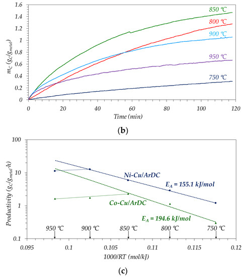 Influence of reaction temperature on evolution of carbon concentration, mC: (a) Ni–Cu/ArDC; (b) Co–Cu/ArDC; (c) Final productivity at 2 h (Dashed line: Arrhenius plot).