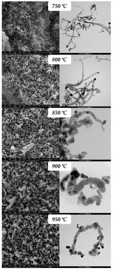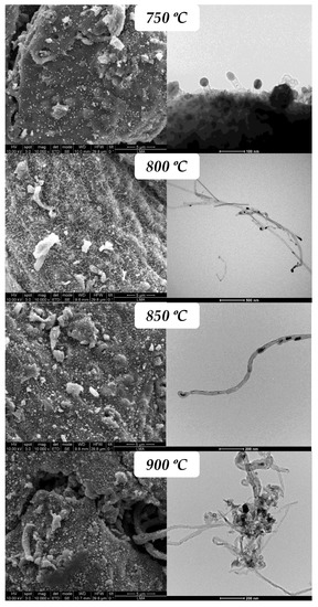 Figure 5 and Figure 6 show the images of electron microscopy, SEM and TEM, of both catalysts after the reaction at the different temperatures studied. As was detected by the kinetic experiments, Figure 3, and the Raman results, Figure 4, these SEM and TEM images confirm the change in the structure and morphology observed as the temperature is increased. For the Ni–Cu/ArDC, the transition temperature is placed in the interval of 800–850 °C, and for the Co–Cu/ArDC, the change is between 800 and 850 °C. In the case of the Ni-based catalyst, Figure 5, until 800 °C the CNMs are mainly composed of CNTs and CNFs with a high proportion of defects as was also indicated by the Raman results. At temperatures above this point, the materials produced are of graphitic nature, that are encapsulating the metal nanoparticles, which are embedded inside these thick and short nanofibers. For the Co-based catalyst, Figure 6, at 750 °C the formation of pristine CNTs is still incipient, and these types of materials are formed, maintaining excellent quality, till 800 °C. From this temperature, the TEM and Raman results show a slight decrease in the quality, but the majority of products still are the CNTs. These results demonstrate that metallic catalysts supported on carbon derived from lignocellulosic residues, such as argan shells, are excellent candidates to produce CNTs of good quality, comparable to that obtained using commercial cellulose [27].