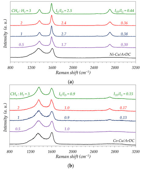 Raman spectra obtained for (a) Ni–Cu/ArDC and (b) Co–Cu/ArDC. Influence of feed composition (CH4:H2 ratio). Reaction temperature: 800 °C.