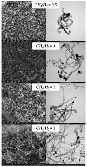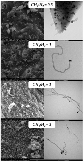 In the case of Co-based catalyst, SEM and TEM results presented in Figure 10, are in total agreement with the Raman results, obtaining the selective formation of CNTs. Thus, at low methane contents (CH4:H2 = 0.5) the formation of CNTs is very incipient, see Figure 10, in accordance with the corresponding Raman spectra in Figure 8b. In these conditions of low partial pressure of methane, the low chemical potential for the carburization of the metallic NPs slows down the diffusion and precipitation of CNTs and therefore the amount and length of the CNTs formed are very low, being only detectable by TEM, see Figure 10.