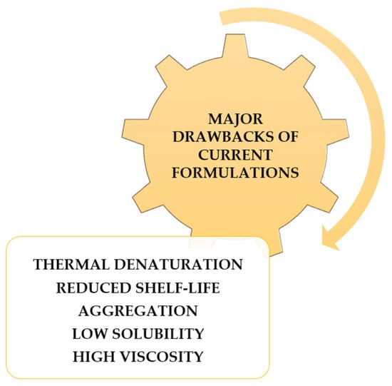 When developing a formulation for proteins, including their use as biopharmaceuticals, there are some variables that should be accounted for, such as stability and biological activity, clinical needs, patient compliance, delivery method, storage and distribution, and market competitiveness [1,2]. Knowing the end goal of the protein-based formulation will help design the formulation that better suits the expected needs [1,2]. The main drawbacks of protein formulation are represented in Figure 1. Preserving the structural integrity and biological activities of these macromolecules, as well as improving their bioavailability or targeting them to specific sites in the body are key ideas to consider when developing a formulation [3]. Due to their various levels of structural complexity (primary, secondary, tertiary, quaternary), protein-based biopharmaceuticals are vulnerable to degradation or denaturation [3]. The primary structure (amino acid sequence) and secondary structure (α-helix or β-sheet) contribute to the tertiary structure of a protein. The tertiary structure of biomolecules, such as proteins is the one that needs to be stabilized against the disrupting forces [4]. During protein storage, thermal denaturation must also be accounted for, as it is the main source of denaturation [5]. As proteins are only marginally stable at room temperature, all types of molecular interactions are to be accounted for, even small interactions can contribute significantly to the stability of proteins [5]. The main type of interactions that contribute to maintaining the three-dimensional structure of proteins is hydrogen bonding, hydrophobic, and ionic interactions [6]. The native conformation of a protein depends on the intramolecular interactions between the functional groups and the intermolecular interactions between solvents and protein functional groups. Besides the temperature, there are also other factors that contribute to changes in protein conformation that may lead to denaturation, namely the addition of polymers, organic solvents, changes in pH or pressure, or the addition of other co-solvents or molecules [6,7].