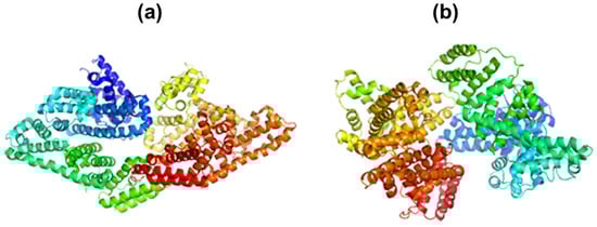 Crystallographic structures from protein data bank (PDB) of: (a) BSA molecule obtained through X-ray diffraction (PDB ID: 3V03); (b) HSA molecule obtained through X-ray diffraction (PDB ID: 1AO6)). Each albumin domain is marked with a different color. The albumin structures have three domains (red, green, and blue) which are divided into two subdomains (light red, light green, and light blue, respectively).