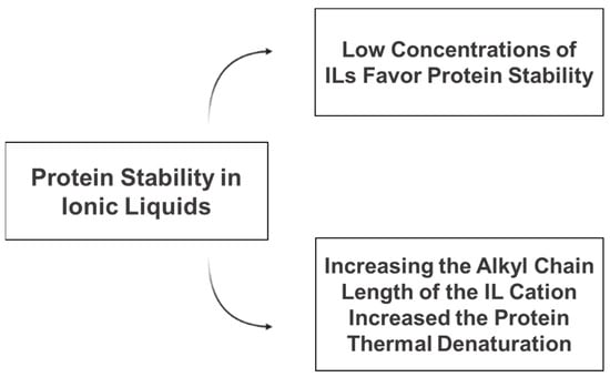 The studies reporting the stabilization of proteins in hydrated ILs are summarized in Table 1 and the main conclusions are presented in Figure 3.
