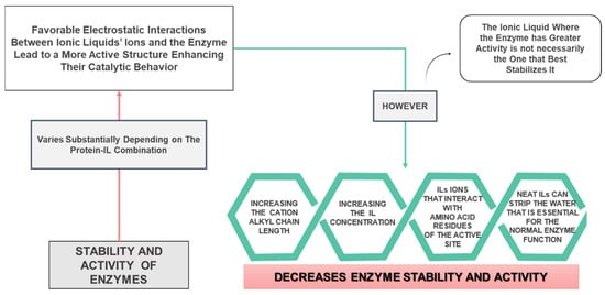 The findings of the studies carried out by Barbosa et al. [74] and Nascimento et al. [75] both show that phosphonium and imidazolium-based ILs can promote contrasting behavior on the activity of lipases (enhance, maintain or even inhibit) and structural conformation, depending on the cation alkyl chain length, the IL anion used and the IL relative concentration [74,75]. The key mechanism that usually governs the lipase catalytic behavior is a result of highly balanced competing interactions between the solvent (water), the enzyme surface and IL cation, anion or the ion pair itself [75]. IL ions and water can reach out with non-polar, polar, and charged surface areas of enzymes, according to their various hydrophobic/hydrophilic/amphiphilic characters, subsequently causing opposite beneficial and unfavorable effects depending on how specific and predominant each of these interactions is [75].