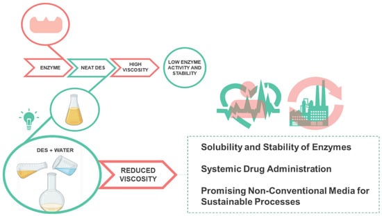 Similar to proteins, recent studies addressing the enzymatic stabilization and activation in DESs will also be discussed in this review. Although DESs were contemplated as a promising alternative medium of enzymatic biocatalysis, these solvents are highly viscous and present comparably reduced enzyme activity. Thus, they are scarcely used at industrial scales up to date [84]. However, as summarized in Figure 5, it has been reported that using DESs as cosolvents, by adding small amounts of water, can increase the solubility and stability of enzymes allowing their use in various applications [84].