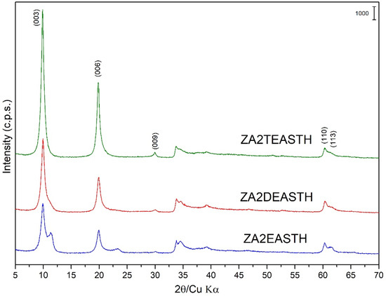 Observing the width and profile of the peaks ascribed to the diffraction plane (003) close to 10° (2θ), the crystallinity of these samples decreased in the order: ZA2TEASTH > ZA2DEASTH > ZA2EASTH. Again, it could be observed how the use of amines (and the nature of these) in the precipitation medium modifies the crystallinity of the solids, to the point of two phases coexisting, with nitrate anion in the interlayer space depending on the amine used.