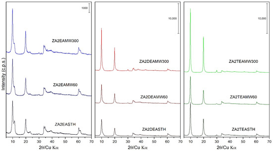 The samples synthesized in the presence of EA, DEA and TEA were also subjected to hydrothermal treatments, using two heating routes: microwave-assisted heating (MW) and conventional oven heating (HT). Figure 2 includes the PXRD plots of these samples with different MW hydrothermal treatment periods. Observing the profile of the diffraction peaks and their relative intensities as the treatment time increased, it can be seen how, unlike the samples prepared in our previous work [27], the application of MW hydrothermal treatment increased the crystallinity of the solids as the MW treatment time increased. Comparing the width of the diffraction peaks (003) of the samples subjected to a longer treatment time, that is, the samples with 300 min of treatment, the following decreasing order of crystallinity could be established as a function of the amine used: ZA2TEAMW300 > ZA2DEAMW300 > ZA2EAMW300. It is noteworthy that, as the MW hydrothermal treatment time was prolonged on the samples synthesized with EA, the relative intensity of the diffraction peak (003) of the phase with the nitrate anion parallel to the brucite-like layers did not increase as the treatment time increased, going from being a well-defined peak in sample ZA2EASTH to being a shoulder of the peak (003) in sample ZA2EAMW300.