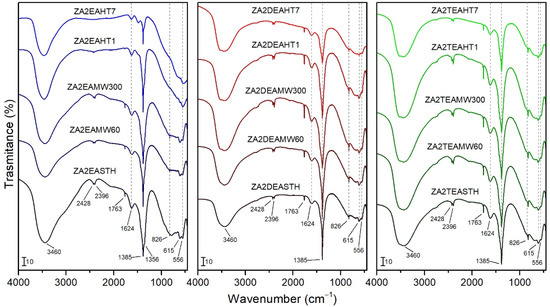 In all cases, the characteristic bands of the vibrational modes of the nitrate anion molecules were recorded, confirming its presence as an interlayer anion. Thus, bands at 1385 cm−1 and 826 cm−1 can be observed, assigned to the ν3(E’) and ν2 (A2’’) vibrational modes, respectively, of with a D3h symmetry [19,38]. At 1763 cm−1 a narrow band can be observed, corresponding to the combination of the vibrational modes ν1(A1′) at 1068 cm−1 and ν4(E’) at 692 cm−1 of nitrate, the latter not clearly observed in the infrared spectra. For sample ZA2EASTH, a shoulder can be seen at 1356 cm−1 (Figure 4), which could be due to nitrate anions in parallel orientation in the second LDH phase observed by PXRD. As observed by PXRD for the samples synthesized in the presence of EA after MW hydrothermal treatment, a crystallinity increase of the phase with the anions in perpendicular orientation took place in detriment of the phase with the anions in parallel orientation to the layers. This effect was reflected in the FT-IR spectra, where the shoulder at 1356 cm−1 became less evident (Figure 4). On the other hand, when DEA or TEA were used as precipitaton agents, such a shoulder was also not observed at 1356 cm−1.