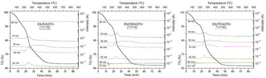 TG curves of the samples without hydrothermal treatment (STH) are included in Figure 5, together with the tracked masses of the gases generated during the process. In all curves, the typical decomposition stages of LDH compounds can be identified. Three decomposition stages could be identified in all TG curves. First, below 180 °C, water removal was observed, as shown by the MS peak at m/z = 18. The second stage of decomposition was observed up to around 300 °C, and corresponded to the release of water from the condensation of hydroxyl groups of the brucite-like layers. Finally, a steady mass loss was observed between 300 and 700 °C, which corresponded to the removal of interlayer nitrate species. The MS signals recorded in this temperature range corresponded to formation of species such as NO, NO2, and N2O, from nitrate decomposition. In all the curves, the process of elimination of the hydroxyl groups practically overlapped with the last stage of decomposition/removal of the interlaminar anion. However, there was better differentiation of the first stage from the second decomposition stage as the degree of substitution of the amino group in the compound used as precipitating agent increased. Thus, for the ZA2TEASTH sample a small plateau could be observed around 200 °C.