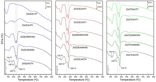 The DTA curves of the samples both without hydrothermal treatment and with hydrothermal treatments, MW or HT, are included in Figure 6. In all cases, endothermic minima associated with the different decomposition processes of the samples can be observed.