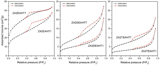 In the case of the solids synthesized in the presence of DEA and TEA, after the application of a HT hydrothermal treatment, according to the PXRD results, an increase in the crystallinity took place, as a consequence of better ordering of the brucite-like layers. Together with the increase in the crystallinity of the solids, an increase in the SBET could be observed and adsorption–desorption curves could be recorded in both cases. Moreover, the prolongation of the HT treatment resulted in higher crystallinity linked to an increase of the SBET value, where, in both series of samples, the SBET value for sample with 7 days of treatment was twice that for the sample with one day of treatment. However, it is important to remember the presence of approximately 2% of ZnO in sample ZA2DEAHT7, which could justify the difference in specific surface area with respect to that of sample ZA2TEAHT7.