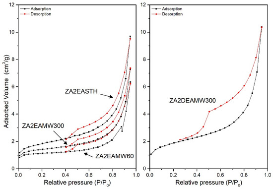 The textural properties of the synthesized solids were studied from the N2 adsorption–desorption isotherms at −196 °C. Table 5 includes the values of the specific surface areas calculated by the BET (SBET) method [41,42], the pore volume (Vpore) and the average pore diameter calculated by the BJH method [42,43] for the synthesized samples. For the samples prepared in the presence of DEA and TEA, both without hydrothermal treatment and with MW treatment, the adsorption capacity was below the confidence limit of the equipment used. Only for the samples with HT hydrothermal treatment (and sample ZA2DEAMW300) did the adsorption measurements present confidence values. This behavior was not observed for samples prepared in the presence of EA, although the samples presented low SBET values, close to the detection limit. Figure 7 and Figure 8 include the corresponding adsorption–desorption isotherms, which correspond to type II according to the IUPAC classification [44,45], corresponding to adsorption on non-porous or mesoporous adsorbents, where adsorption can occur without monolayer-multilayer restrictions. Moreover, it can be observed how all of them presented a hysteresis cycle, corresponding to the H3 type according to the IUPAC classification [42], indicating that adsorption took place in slit-shaped pores formed by layer-like particles.