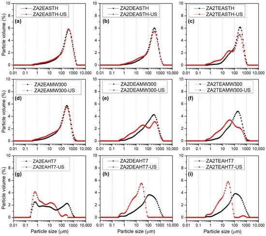 Particle size distribution before (black) and after (red) sonication in water suspension of synthetized samples (a) ZA2EASTH, (b) ZA2DEASTH, (c) ZA2TEASTH, (d) ZA2EAMW300, (e) ZA2DEAMW300, (f) ZA2TEAMW300, (g) ZA2EAHT7, (h) ZA2DEAHT7, (i) ZA2TEAHT7.