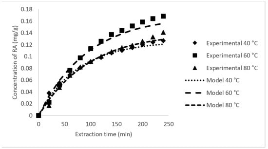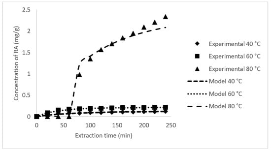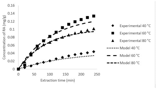 | T (°C) | P (MPa) | Mass Transfer Coefficient (min−1) | RA (mg/g) | Extraction Rate(mg/g min−1) | Equilibrium RA(mg/g) | AARD (%) | R2 | ||