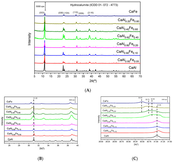 X-ray patterns of samples synthesized: (A) shows X-ray patterns of all samples, while (B,C) show in detail the variation in the position of the peak due to the (110) plane diffraction with the increasing of the Fe3+ content in the solids.
