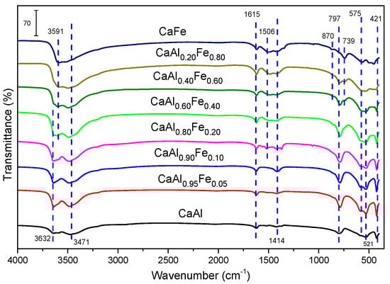 Figure 3 shows the FT–IR spectra of the samples. There were few differences between all the solids. All of them showed bands between 3600 and 3400 cm−1 that corresponded to the stretching vibration of the O–H bonds. The band at 3632 cm−1 was assigned to the stretching vibration of the AlO–H bonds, while the band due to the stretching vibration of the CaO–H bonds was located at 3471 cm−1. On the other hand, as the Fe3+ content increased in the samples, a band appeared at 3591 cm−1, which could be assigned to the stretching vibration of the FeO–H bonds [54,57]. In this zone, the bands corresponding to the hydroxyl groups of the water molecules located in the interlayer space were also found [54,68,69]. The band at 1615 cm−1 was due to the bending vibration of water, which confirmed its presence in the interlayer space. The presence of CO32− ion was confirmed by the band at 1414 cm−1. During the synthesis of the solids, special care was taken to work in an inert atmosphere and decarbonated water was used to avoid the formation of calcite, however, it was possible that the samples fixed atmospheric CO2 during their handling, producing the incorporation of traces of carbonate. The band located at 1414 cm−1 increased its intensity as the Fe3+ content increased, in such a way that for the CaAl sample this band was practically not observed. The presence of CO32− in the interlayer space was confirmed by the existence of bands at 1506 cm−1 and 870 cm−1 in the samples with higher Fe3+ content (CaFe, CaAl0.20Fe0.80 and CaAl0.40Fe0.60) [31,70]. This seemed to contradict the PRXD results, since the larger the size of the interlayer anion, the higher the value of the reticular parameter c should be. The diameter of CO32− is 378 pm [61], while that of Cl− is 336 pm [61]; according to these values, the samples that present a band at 1414 cm−1 should present a higher value of the reticular parameter c. However, according to the values in Table 1, no increase in parameter c was observed with the presence of carbonate in the samples, so the differences in parameter c observed can be attributed to small variations in the degree of hydration of the anions located in the interlayer space. The carbonate may then be adsorbed on the surface or even in the form of very small particles not detectable by powder X-ray diffraction. The bands at 797 cm−1, 739 cm−1, 575 cm−1 and 421 cm−1 were assigned to M–O bonds, where M is Ca2+, Al3+ or Fe3+ [54,68,69,71].