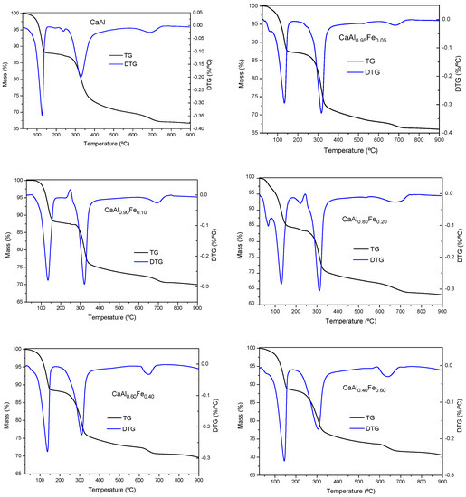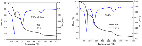 The TG and DTG curves of the samples are shown in Figure 4, all of them were very similar to each other, showing thermal decomposition processes characteristic of LDH [26,66,72], as in all cases the phases identified by PXRD corresponded to LDH and other phases were not detected. In all cases, three main mass loss steps were observed, with a total mass loss between 28 and 36% (theoretical total mass loss for complete dehydration/dehydroxylation of Ca2Al(OH)6Cl·2H2O would be 32.1% and for Ca2Fe(OH)6Cl·2H2O it would be 29.1%). The first one was located at a temperature between 140–150 °C, corresponding to the loss of hydration water located in the interlayer space or chemically bound to LDH [26,66,72]. The second mass loss appeared close to 300 °C and corresponded to the dehydroxylation of the layers. As the Fe3+ content increased, the temperature at which the process took place decreased, from 328 °C for the CaAl sample to 270 °C for the CaFe sample, which indicated that the Fe–OH bonds were weaker than the Al–OH bonds, which was in agreement with the FT–IR results. The third and last mass loss was located close to 700 °C and could be associated with the decarbonization of the samples. However, in our previous work, this last stage was shown to be compatible with the elimination of a water molecule, thus completing the dehydroxylation process to form the corresponding oxychloride [57]. In addition, in some samples (CaAl0.80Fe0.20 or CaFe) an additional mass loss was observed at a temperature below 100 °C, due to the elimination of physisorbed water [63,73]. Considering this thermal behavior, 400 °C was considered the ideal temperature for the calcination of the solids.