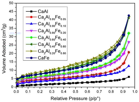 According to the IUPAC isotherm classification criteria [60], all synthesized solids showed type II N2 adsorption isotherms (Figure 5). In addition, some of them showed a small hysteresis loop of type H3 after recording the desorption branch, which corresponded to the presence of plate-like particle aggregates leading to slit-like pores [60]. All samples presented low values of BET-specific surface area (Table 1), with a maximum of 32 m2/g for sample CaAl0.20Fe0.80 and with an average pore width in the mesopore range. In general, as the amount of Fe3+ in the solid increased, there was an increase in SBET values, although, for values m ≥ 0.60, the increase in Fe3+ content did not cause an increase in SBET, with CaAl0.40Fe0.60, CaAl0.20Fe0.80 and CaFe showing similar SBET values (all of them higher than the those of the samples with lower Fe3+ content). This was in agreement with PXRD data because as the Fe3+ content increased, the crystallinity of the samples decreased.
