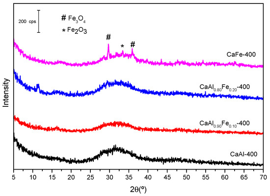 Figure 6 shows the diffractograms of the samples calcined at 400 °C. With respect to the LDH-type solids before calcination, the layered structure completely disappeared, giving rise to the formation of amorphous mixed oxides. In the CaFe-400 sample, the appearance of diffraction peaks corresponding to magnetite (Fe3O4, ICDD card 01–072–6170) and hematite (Fe2O3, ICDD card 01–084–0311) phases was observed. In the samples with lower Fe3+ or no Fe3+ content at all, no crystalline phases were observed.