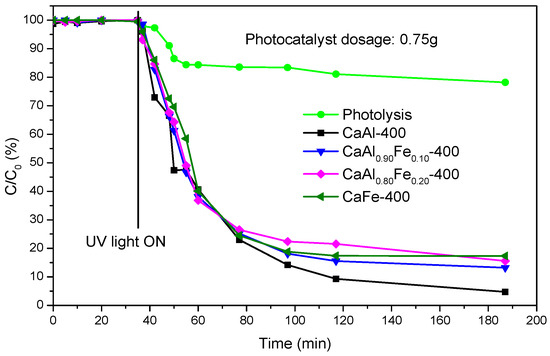 Figure 10 shows the photodegradation of ibuprofen by the action of ultraviolet light in the absence and presence of LDHs calcined at 400 °C. Initially, the photodegradation of ibuprofen was evaluated in the absence of catalyst (photolysis) observing that 78% of the initial ibuprofen still remained after 152 min of irradiation with ultraviolet light in the photoreactor, i.e., in the presence of ultraviolet light but without photocatalyst, 22% of the initial ibuprofen was degraded, higher than the value reported in the literature [38]. When calcined LDH was added, the removal of the contaminant by adsorption was evaluated. For this purpose, the aqueous solution containing 50 ppm ibuprofen and 0.75 g of the photocatalyst was kept under stirring in the dark, and samples were taken at 0, 5, 10, 15, 20 and 35 min, finding that there was no elimination of ibuprofen by adsorption during this time. Subsequently, the ultraviolet light lamp was turned on and new aliquots were taken at various times. The concentration of the contaminant rapidly dropped to ca. 24% of the initial concentration after 42 min switching on the lamp (T77, total time 77 min, 42 from the beginning of photocatalysis) with all the photocatalysts used. Up to this point, no major differences were observed in the percentage of ibuprofen degraded depending on the photocatalyst used; however, after this time of contact, the photocatalyst did not contain Fe3+ (CaAl-400) showed higher degradation percentages. Thus, 152 min after the lamp was switched on, the percentage of the initial ibuprofen remaining in the solution was only 4.7% for the CaAl sample and between 13% and 17% for the rest of the samples, those containing Fe3+. Thus, for long times CaAl-400 photocatalyst showed the best performance and the presence of Fe3+ caused a low negative effect, this may be due to the formation of oxides or mixed oxides of Ca2+, Fe3+ and Al3+ which did not possess photocatalytic properties, even though some of the properties of the photocatalysts were improved, such as SBET which increased with increasing the Fe3+ content. This behavior is similar to that reported on LDH-ZnFe systems, also calcined at 400 °C [51], in which ibuprofen degradation improved as the Zn/Fe ratio increased.