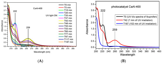 Ultraviolet-visible spectra of samples taken at different times when the CaAl-400 photocatalyst was used. (A) UV–Vis spectra of all samples taken at different times; (B) UV–Vis spectra of ibuprofen (T0), aliquot at T42 and aliquot at T187.