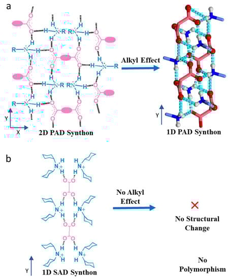 Alkyl effects on dicarboxylate salts. (a) Van der Walls’s interaction at an increased alkyl chain in the amine part transforms the 2D Primary Ammonium Dicarboxylate (PAD) synthon to 1D synthon. The backbone of a dicarboxylic acid, marked by pink ovals, acts as a linker between the two parallel 1D hydrogen-bonded network (Y axis) to propagate an orthogonal growth towards the X-axis in building an overall 2D synthon. After increasing the carbon chain length at the primary amine part, the alkyl group (light blue) shows the lamellar effect with 360° orientation around the 1D synthon and bends the carboxylic acid backbone to generate the tubular structure. (b) No alkyl effect was found on the robust 1D Secondary Ammonium Dicarboxylate (SAD) synthon.