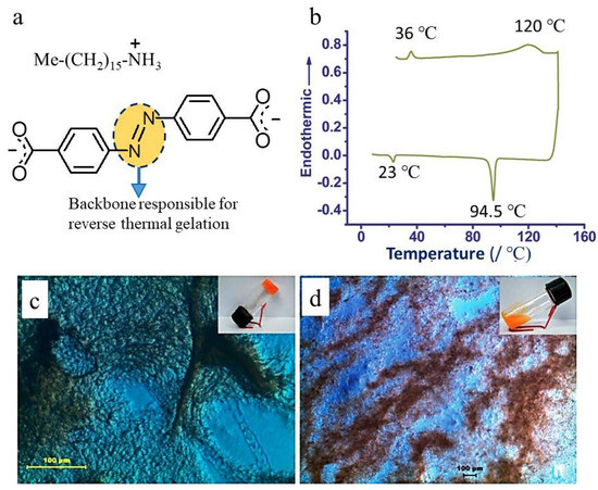 Reverse thermal gelling behavior of dicarboxylate salts. (a) Heat-set gel derived from hexadecylammonium azobenzene-4,4′-dicarboxylate. (b) DSC of 5.0 wt % DMSO gel (the heating and cooling scan was 10 °C min−1). (c) HOPM of the semitransparent heat-set gel, made with chloro-benzene (bp 132 °C); the image was taken at 180 °C in an open atmosphere (Scale bar 100 μm). (d) Formation of colloid during a cooling cycle at room temperature (Scale bar 100 μm) ((b–d) adapted with permission from Ref. [6]. 2012, Royal Society of Chemistry).